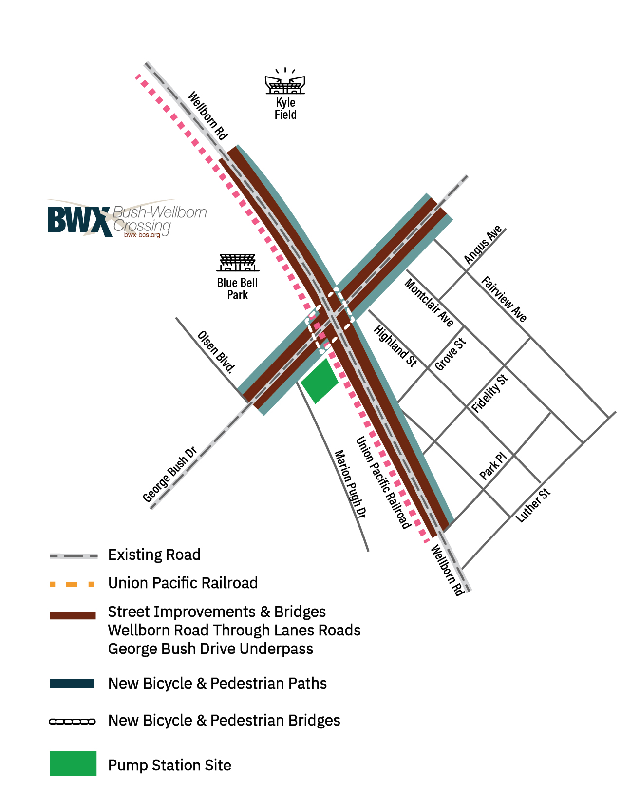 To make conditions more challenging, the Union Pacific Railroad track runs next to Wellborn Road and crosses George Bush – blocking traffic during every one of the 20-or-more trains each day. With rapid growth in student housing to the south and southwest of the Texas A&M campus, traffic through this intersection continues to increase. Brazos County is in the top ten percent of the fastest growing counties in the United States… And the County’s population is expected to grow from 240,000 now to 350,000 by 2040. These factors will make congestion worse at the already overloaded intersection.
